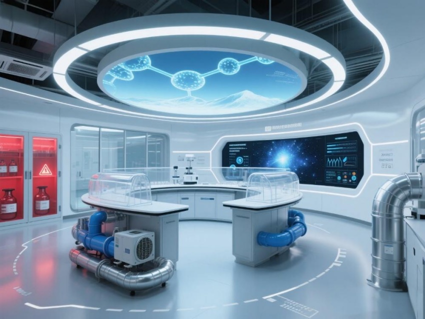 本實驗室以"絕對環境控制"為核心設計理念,整體采用冰川藍與鈦白灰的漸變配色。墻面嵌入式環境參數監測屏實時流動著翡翠綠數據流,與頂棚矩陣排列的微孔送風口形成科技韻律。核心實驗區采用圓弧形防結露玻璃隔斷,內置百級潔凈層流罩。地面鋪設防靜電陶瓷鋼板,接縫處嵌入LED環境達標指示燈。設備區裸露的銀色保溫管道與藍色冷媒管構成工業美學展陳,智能除濕機組通過半透明外殼展示內部冷凝過程。數據中控室配備270°曲面監控屏,懸浮粒子濃度以動態星云圖呈現??臻g通過嚴謹的幾何分割與流體力學曲線結合,在極致環境控制要求下,打造出兼具科研嚴肅性與星際艙未來感的頂級實驗環境。