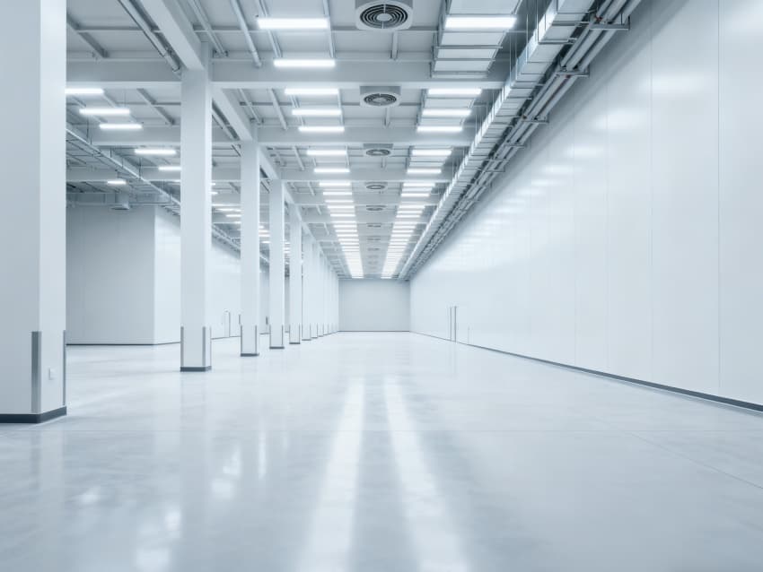 內部6個生產車間均為無設備空曠布局,按工業級潔凈與承重標準建設:地面鋪設耐磨防靜電環氧地坪,墻面采用白色環保潔凈墻板,陰陽角做圓弧處理減少積塵;柱網間距達10米,預留設備安裝與物流通道空間;頂部整合恒溫恒濕新風系統與節能LED照明,管線暗藏于吊頂內,避免空間雜亂;車間之間通過通透玻璃隔斷銜接,進一步強化整體空曠感,為新能源產品規?;a、柔性產線調整提供高效、潔凈的空間支撐。