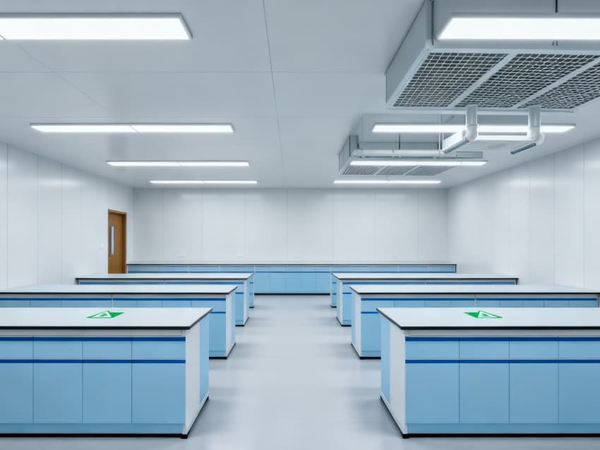 在核心操作區域,我們執行的是高標準的潔凈要求,每立方米空氣里直徑0.5微米以上的灰塵、顆粒等雜質不能超過352000個,相當于達到了萬級潔凈標準(國際ISO8級)。而像走廊、儲物間這些輔助區域,要求會稍微低一些,執行的是十萬級潔凈標準(國際ISO9級)。采用初效-中效-高效三級空氣過濾系統,配合側送頂回氣流設計,實現每小時18-22次空氣置換;墻面選用耐酸堿潔凈彩鋼板,地面為防滑PVC無菌卷材,所有邊角做圓弧密封處理,減少清潔死角。室內溫度穩定在22±2℃,相對濕度控制在45%-55%,關鍵實驗區維持微正壓,有效隔絕外界污染與交叉感染,既符合高校生物實驗教學規范,也為科研數據準確性提供可靠環境保障。